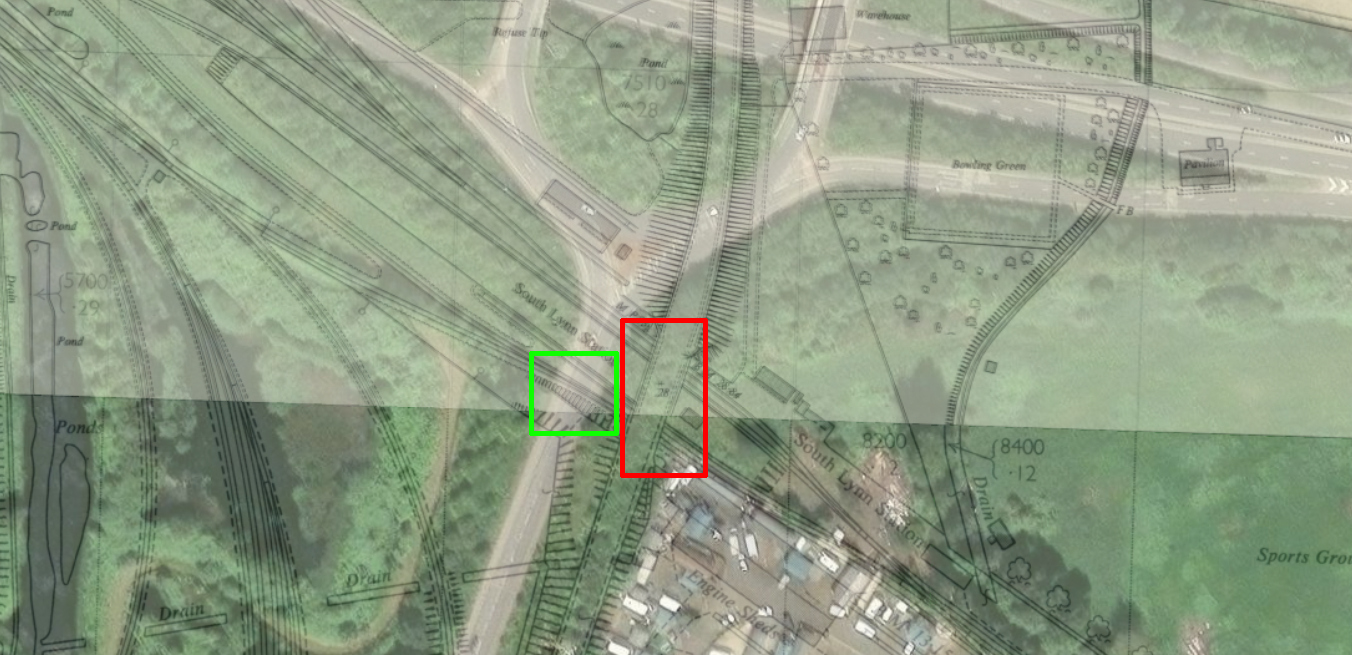 The current High Road at the location of this bridge existed back in M&GN times; there was a much larger bridge that crossed the M&GN more or less here. A slight realignment of High Road when the Saddlebow Roundabout was constructed means that the extant bridge is about 20 metres to the west of the old one, as you can see in the map below with the old and new locations marked on a map overlaid on satellite imagery.3