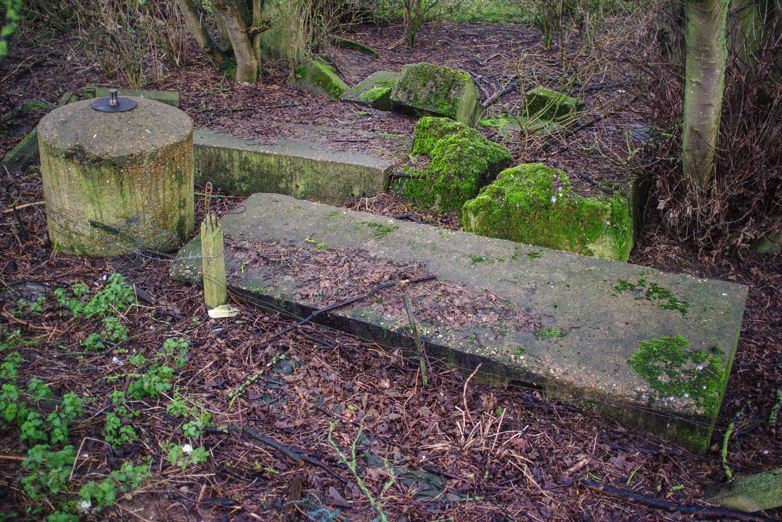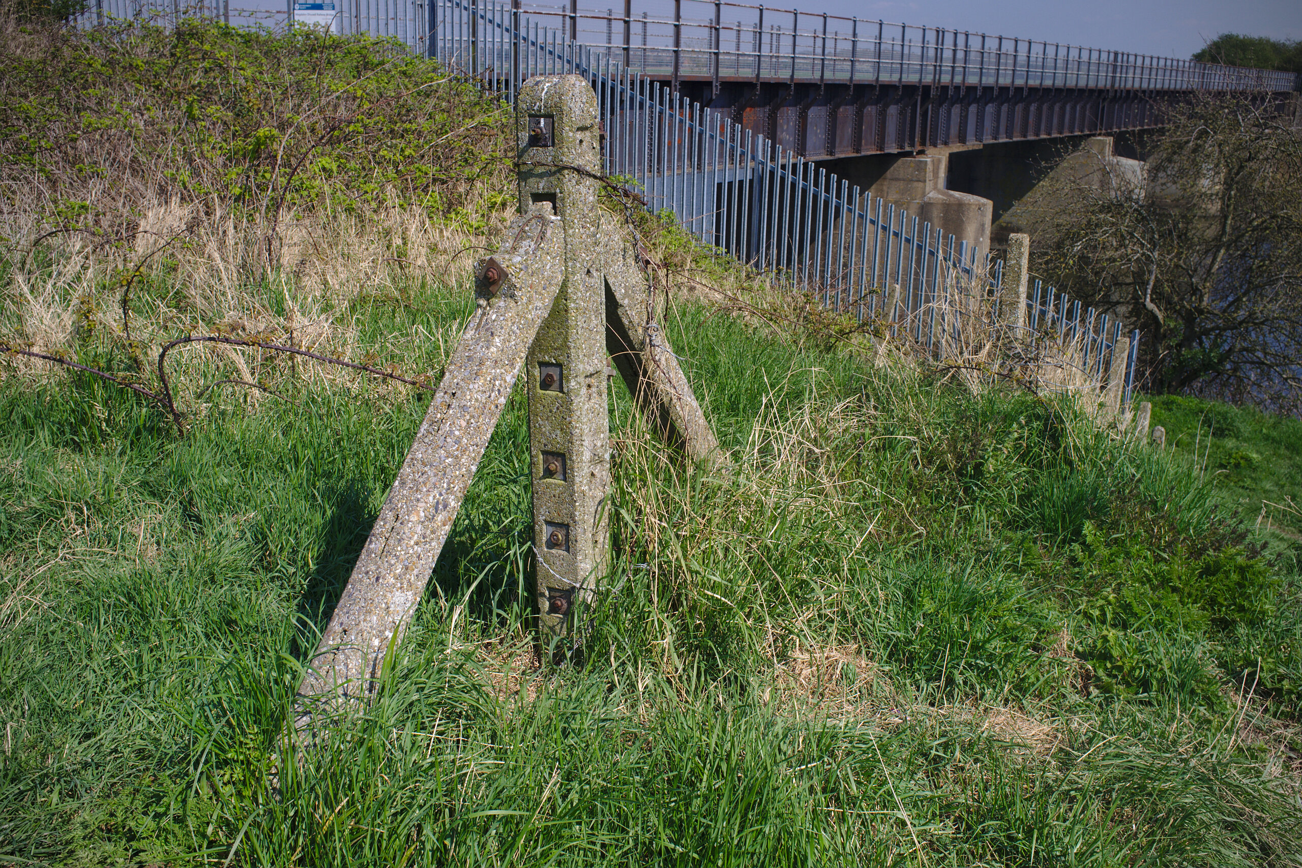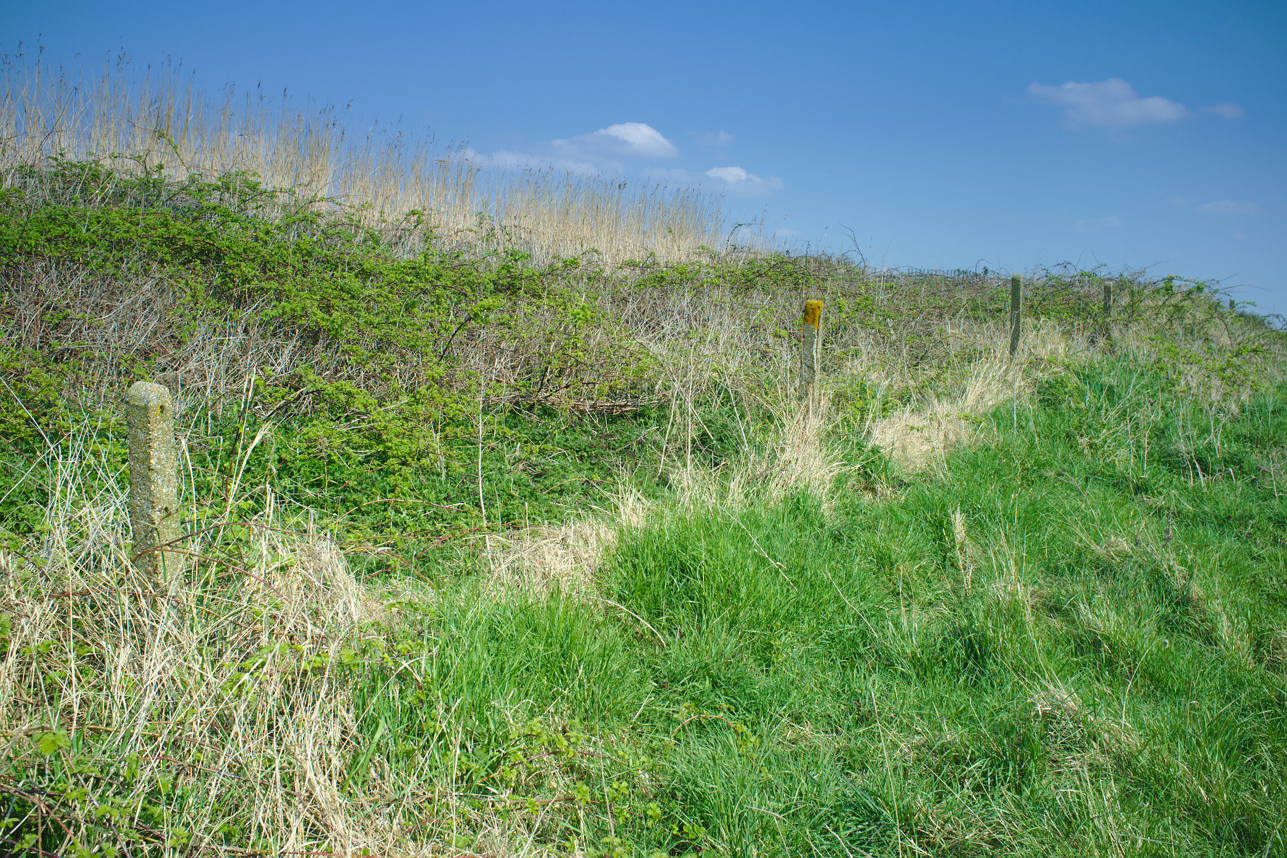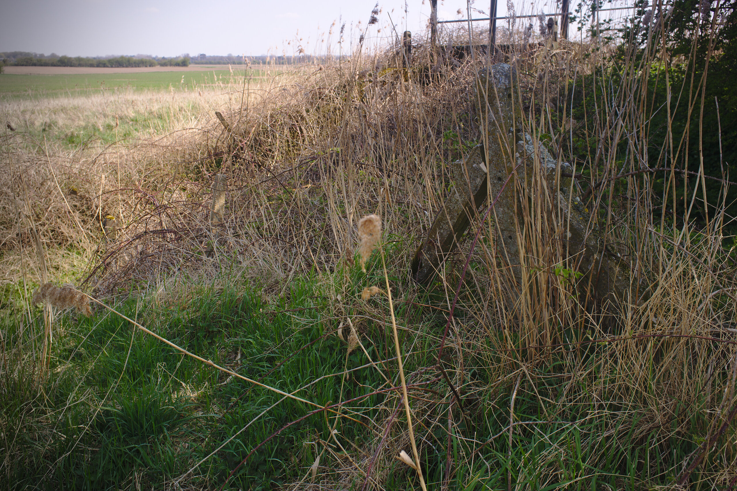 So, let’s head to the other side of the Ouse. This is a stone’s throw away if you have a good arm. Because there’s no bridge this will be about two thirds of a mile; you’ll need to walk down to the road bridge in Magdalen, cross over, and head back up. There’s an identical abutment to the one above which I didn’t photograph, because it looks the same. Instead, head east towards the relief channel and you will notice an embankment. Lining the bottom of this embankment are some concrete fence posts, clearly of railway origin.