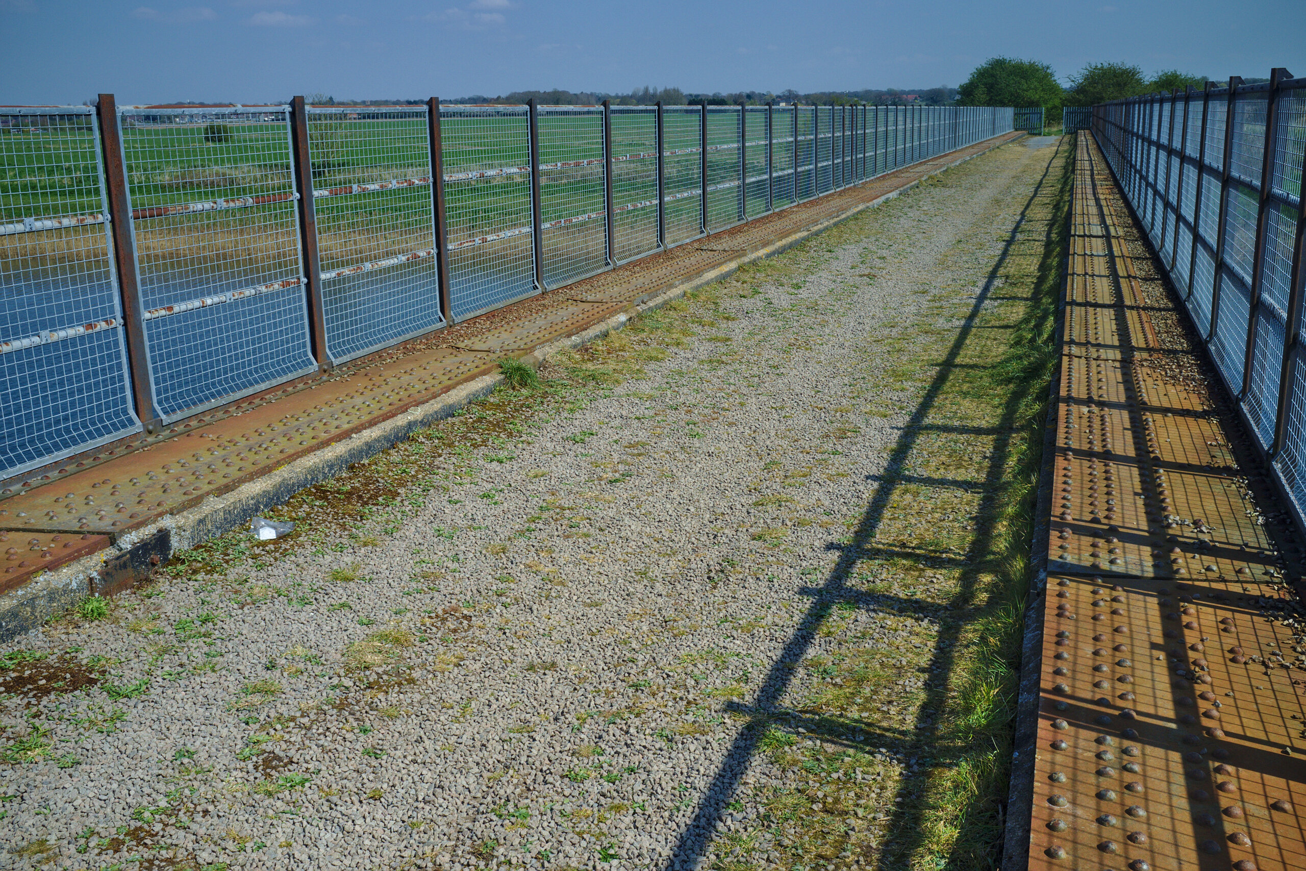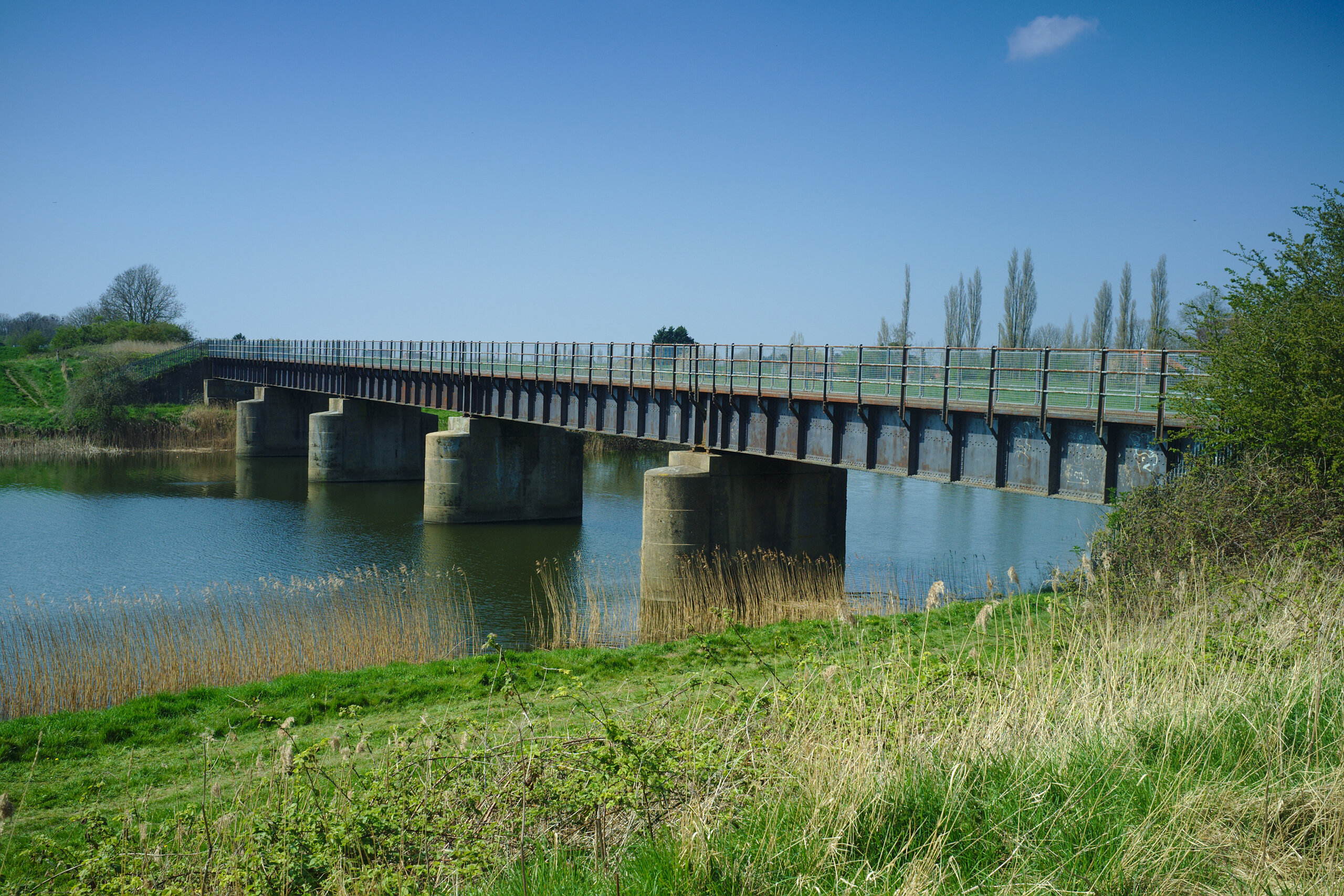 I am unsure about the history of this bridge. Its deck seems quite Victorian in style. Yet, the Great Ouse Relief Channel it spans was constructed in the early 1960s, and its concrete piers and abutments seem to be clearly of that era. I speculate, but do not at all know (and would like to know), that the deck may have been transplanted from some other railway that was closed. This bridge only had a very few years in railway service before the line to Wisbech was closed.