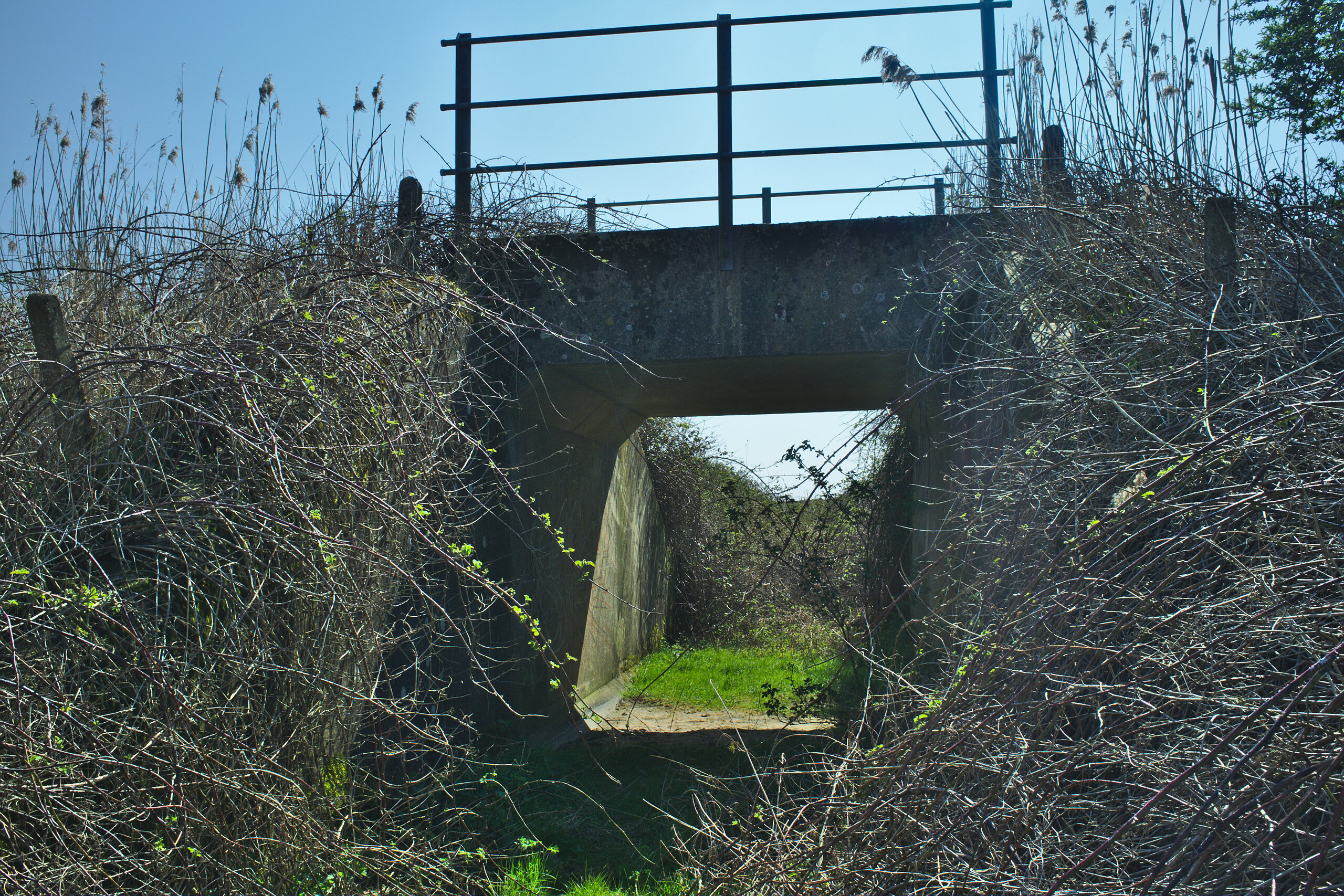 Yet, just to the East of this is another bridge that is probably less well-known; you could easily miss its existence if you are walking along the bank of the Relief Channel. You can see it if you look really closely at the middle bottom of the second drone photo above. From the ground, it’s rather well-hidden by undergrowth, but again the fence posts give it away…