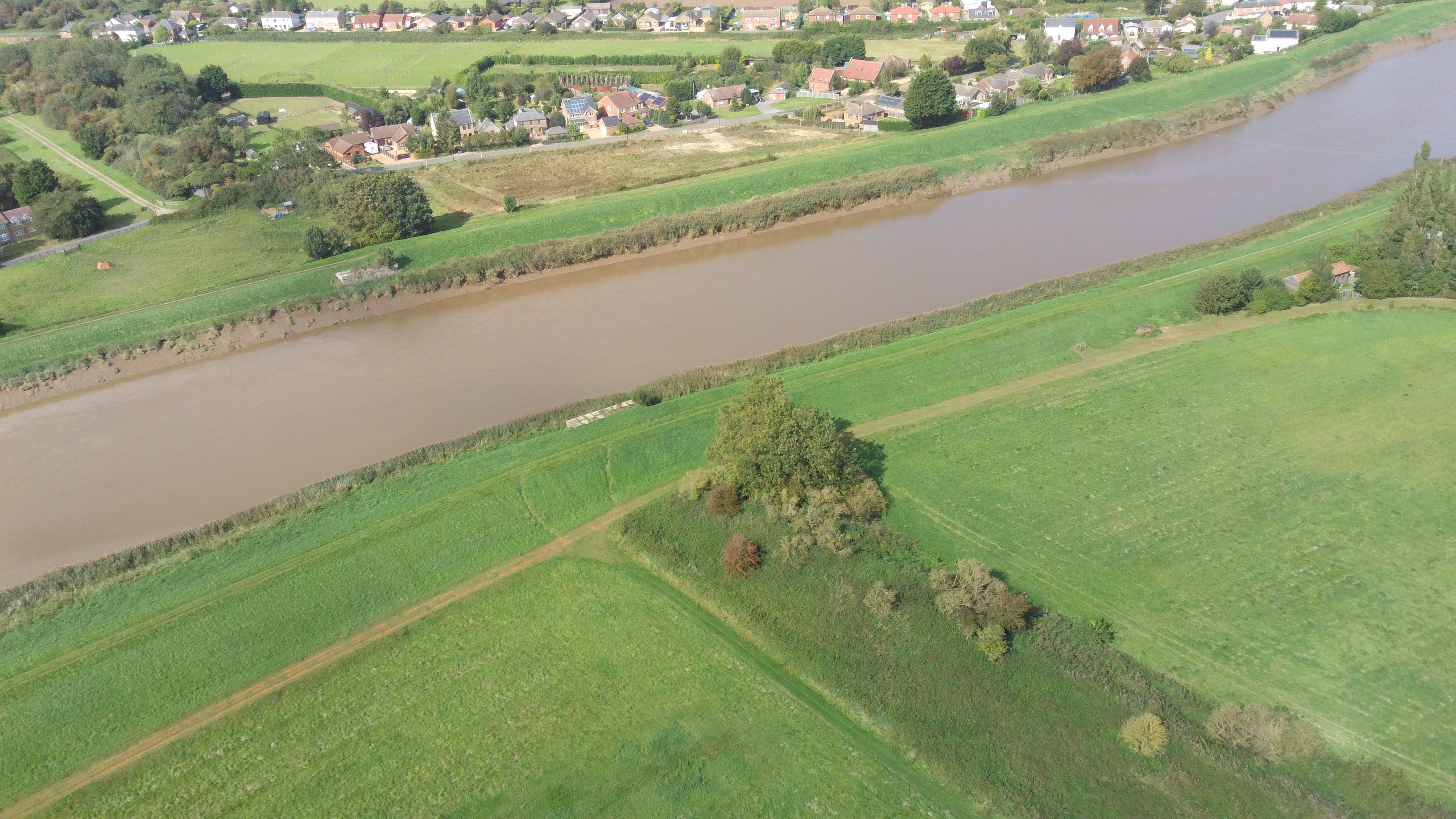 Seen from the air (the Norfolk’s Disused Railways drone), you can see where our bridge crossed the Ouse, and you can also see an embankment leading up to it on the other side of the river.