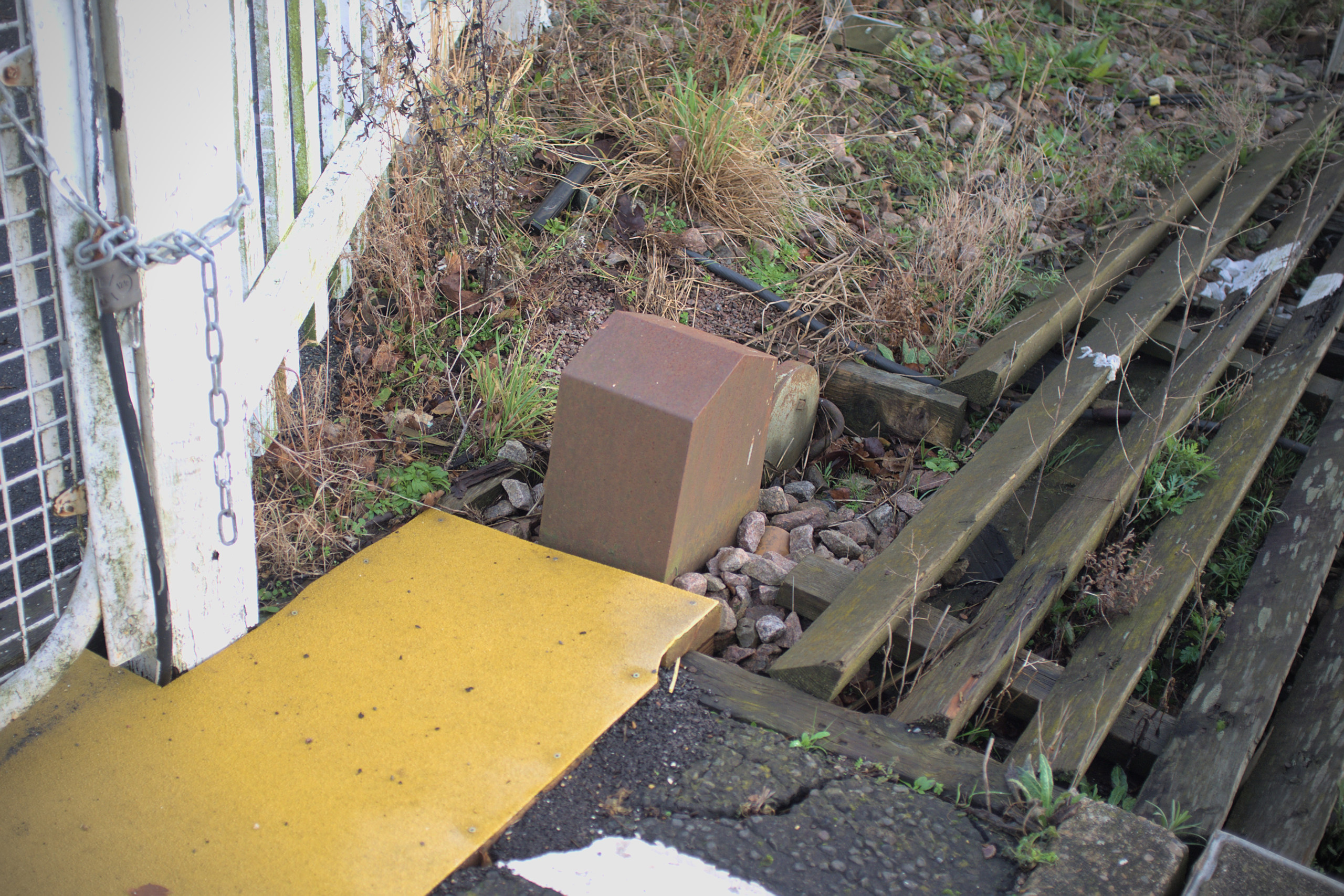 If you don’t notice the change in surface when looking at it, you might notice the change of sound when you walk on it. The older front half of the platform is tarmac on top of compacted earth with brick retaining walls, and the newer rear half is of wooden construction with plywood on the top. For most of its life this platform was about 50 metres long; about long enough to safely disembark passengers from two modern carriages.2 This was extended rearwards – that’s the wooden section – at a date unknown in preparation for the then-new four-car electric trains which took over the line in 1992.