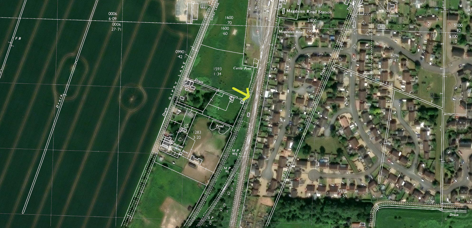 But this actually tracks a long siding (about 350 metres) that extended its way south-ish from the station then curved around following the Wisbech branch but on a slightly tighter radius. The junction with the Wisbech line is just a short distance south. In the first picture above, the siding is tracked by the line of shrub and then tree on the right hand side; in the second, on the left. It’s indicated with a yellow arrow below (best viewed at full size to avoid aliasing artifacts on the fine lines).