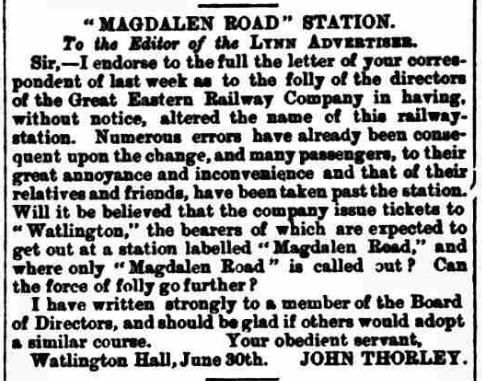 Watlington was given a new name after that city gent boarded the train at Liverpool Street and asked for…Watlington station. He duly arrived and discovered he was not in the village of Watlington in Oxfordshire as he had hoped, but in dear old Watlington in Norfolk. Complaints were made. The name was changed to Magdalen Road.6