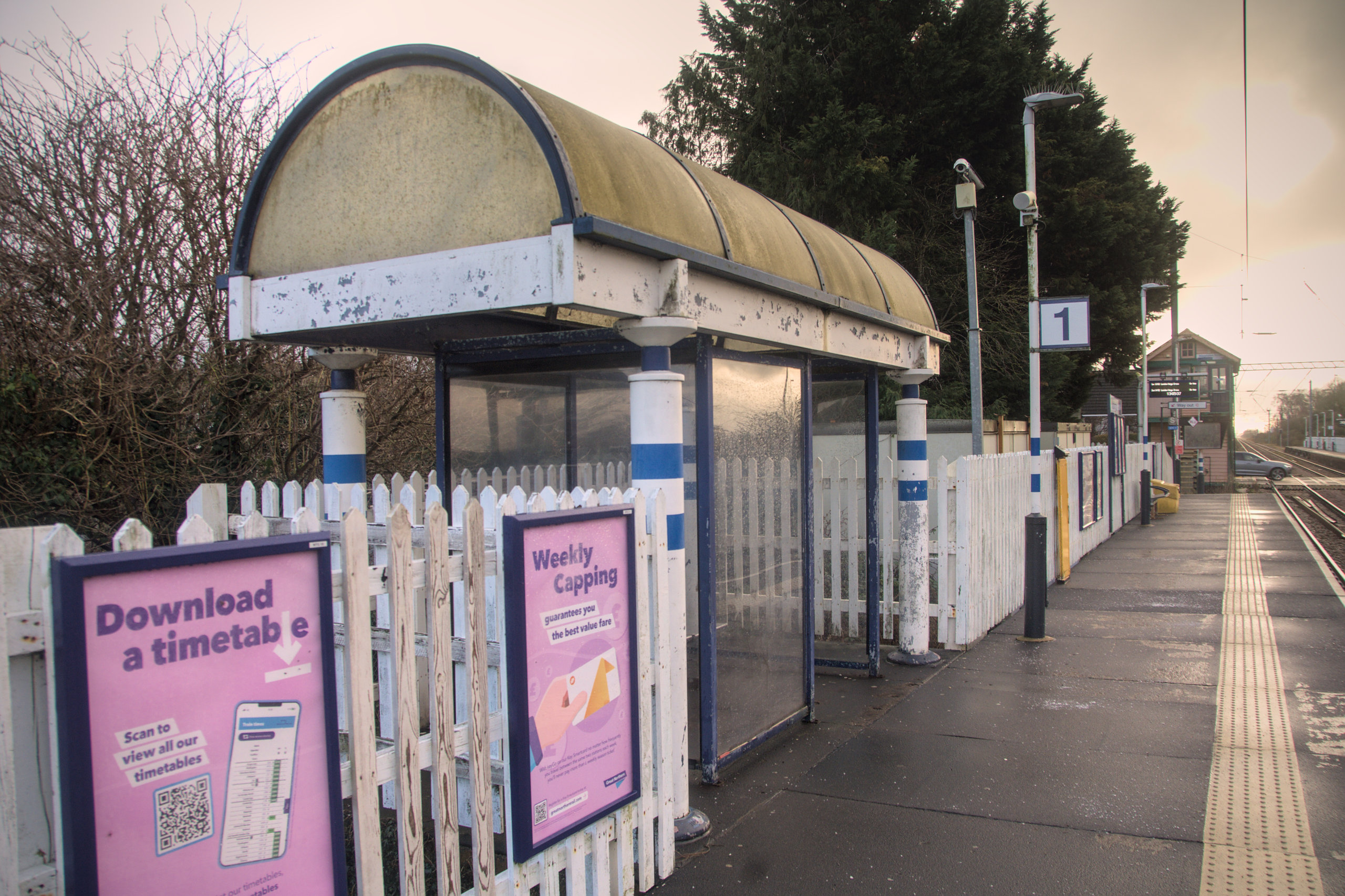That is distinctly late-80s to early-90s in style; it bears more than a passing resemblance to early Docklands Light Railway platform shelters. This was a somewhat later addition; this platform opened without a shelter.22 These days at peak times the station is often too busy to fit everyone into the shelter anyway, so for some number of people it might as well not have one.